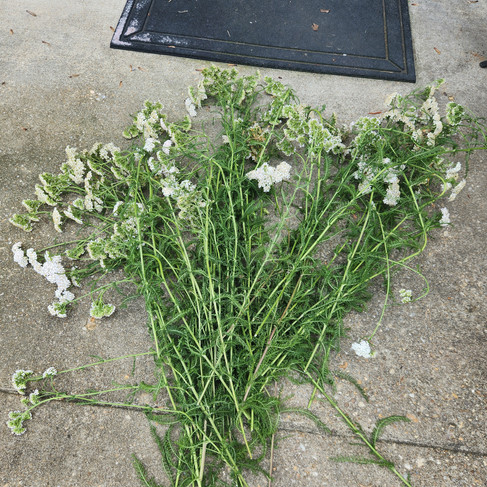 I recently harvested and dehydrated yarrow from my garden. It's recommended that you harvest when the blooms are fully open and when you can smell it and in the afternoon once the dew has evaporated. Typically when I'm processing herbs I'll leave them on the step for a bit to wilt and to let the bugs wander off. I then separated the blooms from the leaves and dehydrated fully! Ready to be made in to tincture and powdered.